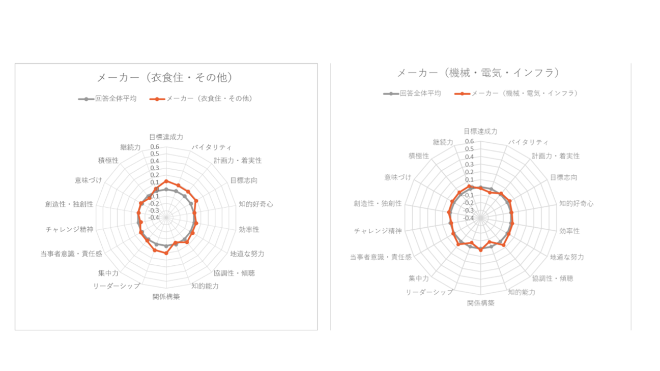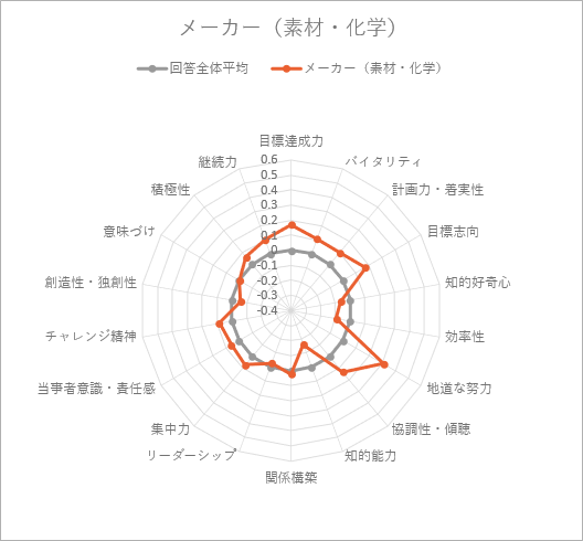 メーカー(素材・化学)では「地道な努力」が平均より高く、研究開発や品質管理に求められる粘り強さを反映しています。長期間にわたり実験や検証を積み重ねる場面が多いことが背景にあり、学生自身も「コツコツと積み重ねる姿勢」を学業を通じて強みとして認識していると考えられます。(図3)