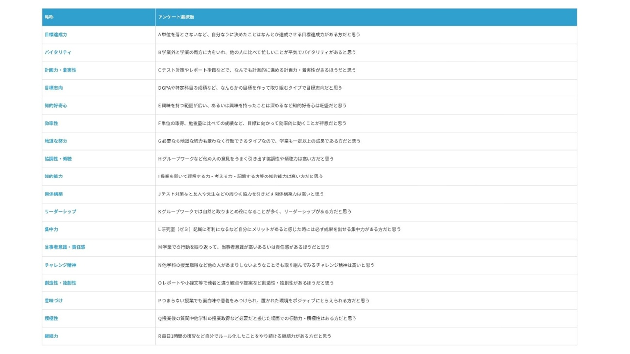1点目に関しては、多くの学生が複数の学ポタを自覚しており、「目標達成力」「協調性・傾聴力」「知的好奇心」「計画力・着実性」など、幅広い資質が学業の中に表れていました。