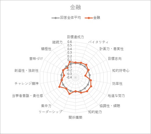 金融では際立った差は見られませんでした。しかしこれは強みがないというより、多様な資質を持つ学生が幅広く採用されている結果と解釈できます。金銭を扱うという性質上、計画性や慎重さが求められると同時に、組織を率いるリーダーシップも必要とされるため、平均的に見える裏側には「幅広いタイプの人材を受け入れる業界特性」があるといえるでしょう。(図6)