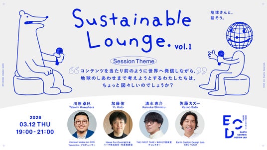 地球中心デザイン研究所(本社:東京都港区、代表:佐藤カズー、以下ECD)は、クリエイティブと持続可能性の新たな交差点を提示するトークシリーズ「サステナブルラウンジ」を始動いたします。 その記念すべき第1回を、2026年3月12日(木)にECD本社にて開催することをお知らせいたします。