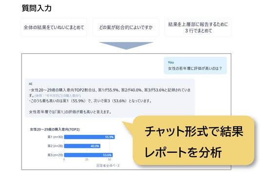 「どの案が総合的によいですか?」「ターゲット層での評価は?」「要点を3行でまとめて」といった質問に対し、レポート内容を参照して回答します。