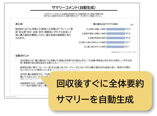 これまでのAIによるテキスト回答分類に加え、今回新たに分析フェーズへの生成AI技術を導入しました。これにより、アンケート完了と同時に要点や傾向が整理され、意思決定の材料が即座に得られる「次世代のリサーチ体験」を提供します。