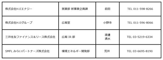 本契約に基づき、H.Eエナジーは太陽光発電所の開発・施工を実施し、SMFLみらいパートナーズは合同会社を通じた発電所の取得・運営、および国内の需要家向けにコーポレートPPA※2の提供を行います。H.Eエナジーは太陽光発電事業を主力事業とし、用地開発からEPC、O&Mまで太陽光発電に係るサービスをワンストップでお客さまに提供しています。北海道・東北エリアでさまざまなスキームに柔軟に対応できる数少ないEPC事業者です。SMFLみらいパートナーズは、SMFLグループの顧客基盤を強みに、全国の需要家に対してコーポレートPPAの提供が可能な体制を整えています。北海道エリアでの太陽光発電所の取得は今回が初めてとなります。