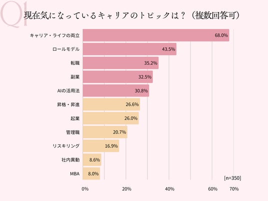 「現在気になっているキャリアのトピック」について聞いたところ、最も多かったのは「キャリア・ライフの両立(68.0%)」、2番目は「ロールモデル(43.5%)」、3番目は「転職(35.2%)」であった。