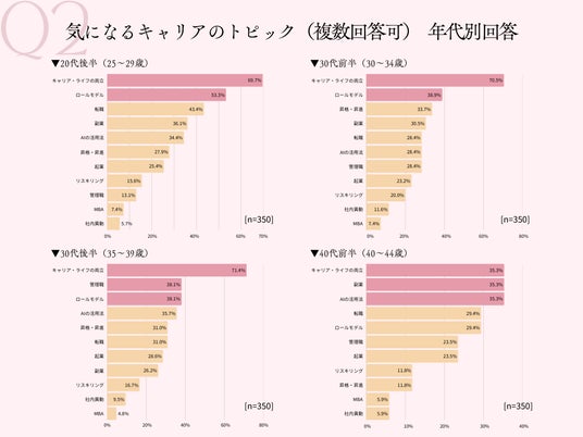 一方で、2位以下には年代ごとの違いが見られた。 20代後半では「ロールモデル(53.3%)」が高く、次いで「転職(43.4%)」が続いた。将来像を模索しながら次の一手を考えるフェーズであることがうかがえる。30代前半では「昇格・昇進(33.7%)」や「副業(30.5%)」への関心が高まり、転職(28.4%)は20代後半よりもやや低下した。社内でのキャリア形成を意識する傾向が見られる。 30代後半では「管理職(38.1%)」への関心が高まり、マネジメントやポジション形成への意識が強まっている。40代前半では「副業(35.3%)」「AIの活用法(35.3%)」など、複線的なキャリア設計への関心が目立つ結果となった。