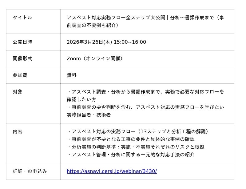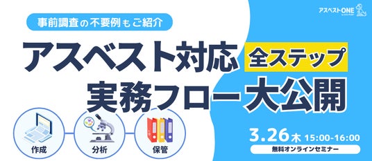 クラウド型アスベスト業務管理システム「アスベストONE」を提供する株式会社EMS(本社:東京都千代田区、代表取締役:星 美耶)は、建設・解体などの工事関係者を対象に、アスベストの基礎知識と現場での安全対策を解説する無料Webセミナーを公開することを発表しました。
