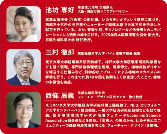 京都先端科学大学(京都市右京区、学長 前田正史)は、7月9日に第8回「KUAS京都先端セミナー」を開催します。「KUAS 京都先端セミナー」は、本学教員と各分野の専門家・文化人との対話を通じて、社会に対し幅広い学びの機会を提供することを目的に、歴史、科学、文化、経済などの分野にスポットライトを当て、未来へのメッセージを考えるイベントです。第8回目となる今回は、大阪・関西万博のテーマ「いのち輝く未来社会のデザイン」をモチーフにして、『「いけばな」と自然科学の意外な共通点から見えてくる、私たちの「未来の創り方」とは?』をテーマに行います。華道家元池坊 次期家元で、大阪・関西万博のシニアアドバイザーも務める池坊 専好氏と植物の生命現象などを研究する植物生理学の専門家である本学 バイオ環境学部学部長 三村 徹郎教授、「未来人」の視点で社会設計を考えるフューチャーデザインの提唱者である本学 西條 辰義特任教授によるユニークなトークセッションです。