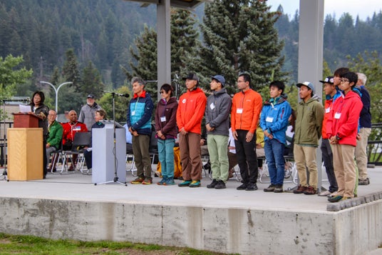 アルバータ初登頂100周年記念式典であいさつをする橋本会長とYOUTHCLUBカナダ合宿のメンバー