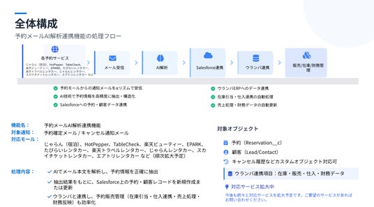 今回のアップデートにより、「αリズム」は予約モールから届く 予約メール・キャンセルメールをAIが解析し、構造化データとしてSalesforceへ即時登録・更新 できるようになりました。