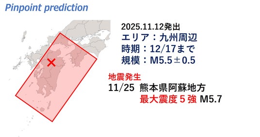 結果として、2025年11月25日に最大震度5強(マグニチュード5.7)を記録する地震が発生しました。JESEAの予測は、発生地点・時期・規模のいずれにおいても実際の地震と一致しました。