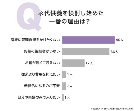 そこで今回、離檀代行、墓じまい代行業者『わたしたちの墓じまい』(https://kaiso.or.jp/haka/)を運営する株式会社フーフー(本社:神奈川県藤沢市、代表:高木)は、永代供養を検討している男女100人を対象に「永代供養に関する実態調査」を実施しました。
