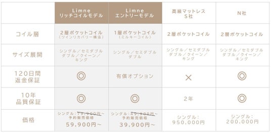 株式会社LIMNE(リムネ)(本社:東京都渋谷区、代表:合谷賢幸)は、 100万円を超える高級マットレスに多く採用されている「二層ポケットコイル構造」を採用した新シリーズ「Limneリッチコイルモデル」と、新感覚な寝心地をもっと身近に感じていただける「Limneエントリーモデル」を発売いたします。