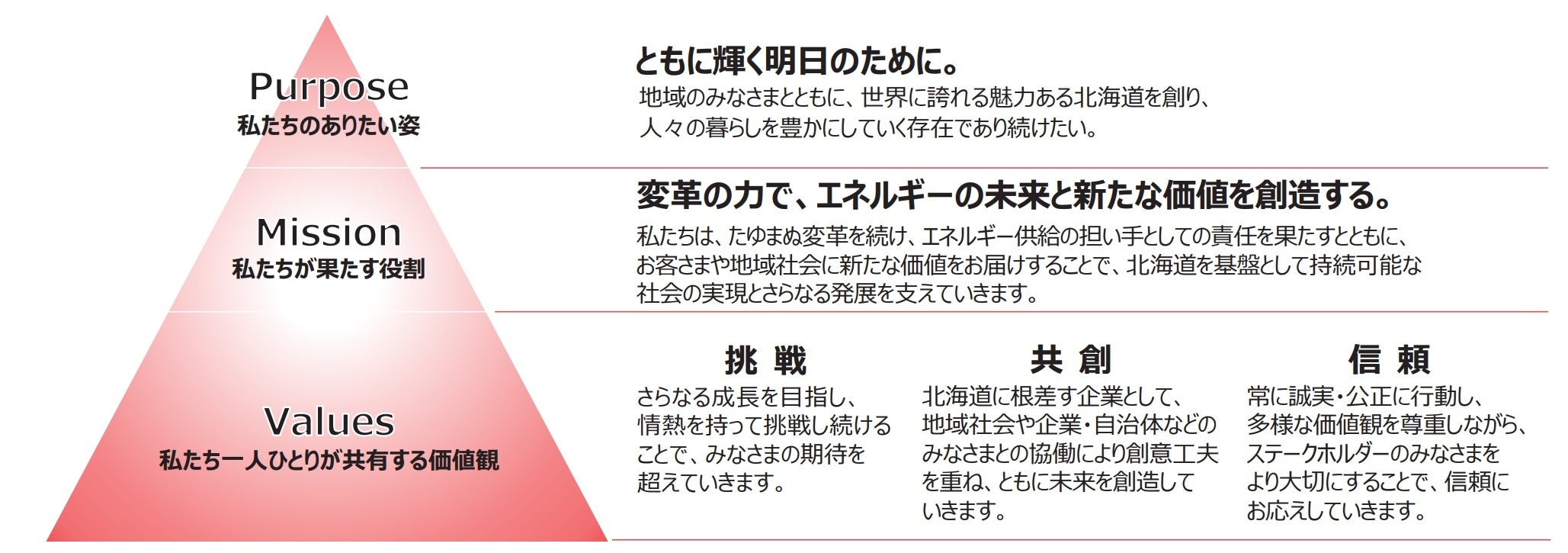 当社は、2025年3月に経営理念を刷新しました。新しい経営理念では「世界に誇れる魅力ある北海道を地域の皆さまとともにつくり上げていく」ことを掲げ、北海道の発展に貢献することが我々の存在意義であることを改めて明確にしました。