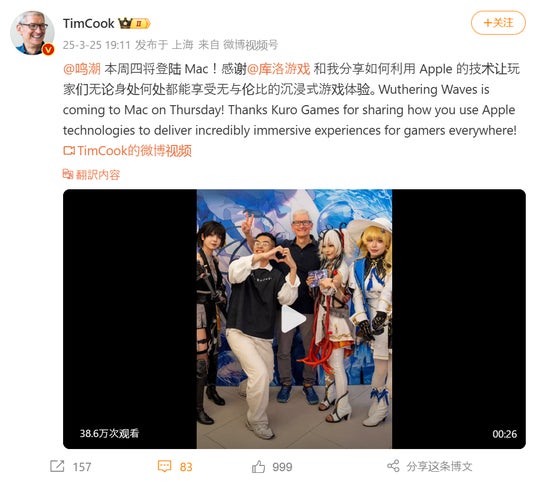 最も注目を集めたのは、特別ゲストとしてアップルCEOのティム・クック氏と『鳴潮』のプロデューサー李松倫氏が登場したことです。会場では「李松倫、愛してる!」という熱狂的な声が上がるなど、ファンの熱気に包まれていました。またティム・クック氏はイベント後にSNS「Weibo」にて投稿しており、この投稿は大きな話題となりました。