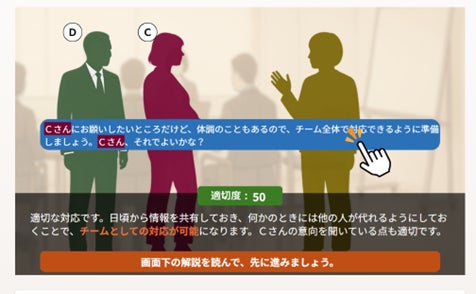 この教材では、職場のメンバーが置かれた状況を踏まえたうえで、自分の選んだ言葉が相手や周囲にどのような影響を与えるのかを模擬体験することができます。