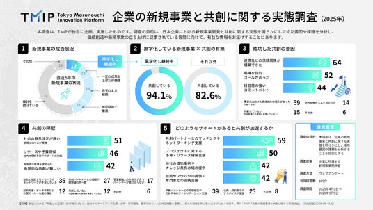 大企業の新規事業創出支援や大企業とスタートアップ、産・官・学・街との連携で事業創出を目指すオープンイノベーションプラットフォームTokyo Marunouchi Innovation Platform(以下、TMIP)は、企業に所属する新規事業関係者109人を対象に「企業の新規事業と共創に関する実態調査」を実施いたしました。本調査は、企業の新規事業と共創に関する実態を明らかにし、成功要因や課題を分析することで企業のイノベーション活動を支援することを目的としています。