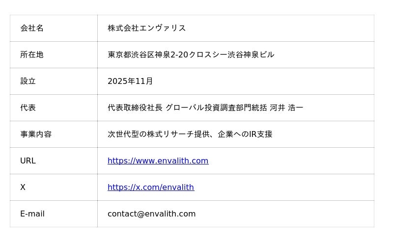 次世代型の株式リサーチ・プラットフォームを展開する株式会社エンヴァリス(本社:東京都渋谷区、代表取締役社長:河井 浩一、以下「当社」)は、辻・本郷ITコンサルティング株式会社(本社:東京都渋谷区、代表取締役社長 黒仁田 健、証券コード:476A、以下「辻・本郷ITコンサルティング」)のリサーチ・カバレッジを開始することをお知らせいたします。