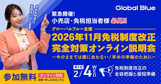 免税システムの世界的リーディングカンパニーであるグローバルブルー・ティエフエス・ジャパン株式会社(本社:東京都千代田区、代表取締役:清水克俊、以下「グローバル・ブルー」)は、2026年11月1日の日本の免税制度の「リファンド方式(還付方式)」への完全移行に向け、小売事業者の皆様が“今すぐ着手すべき準備”を分かりやすく解説する無料オンライン説明会を、2026年2月4日(水)から3月10日(火)まで配信します。