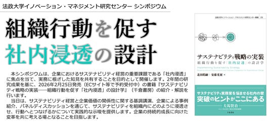 2026年3月に、法政大学イノベーション・マネジメント研究センターのシンポジウム「組織行動を促す社内浸透の設計」を開催することになりました。本シンポジウムは、企業におけるサステナビリティ経営の重要課題である「社内浸透」に焦点を当て、実務に根ざした知見を共有することを目的として開催します。2年間の研究成果を基に、2026年3月5日発売(ECサイト等で予約受付中)の書籍『サステナビリティ戦略の実装:組織行動を促す「社内浸透」の設計学』(千倉書房)の紹介・解説も行います。