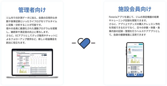 導入施設では会員向けアプリ「Feneria」が自動で利用可能となり、ジム内外の健康データを一元管理することができます。