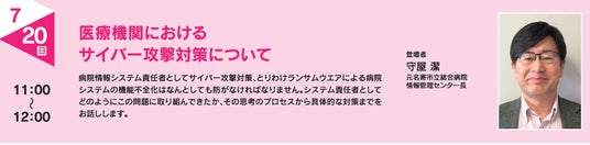 医療フェアの二日目、7月20日(日)11:00~12:00には守屋 潔様のセミナー「医療機関におけるサイバー攻撃対策について」の中でAppGuardのご紹介を頂きます。