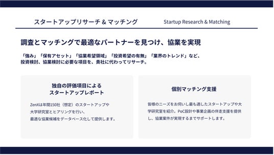 ZenXは年間150社(想定)のスタートアップや大学研究室とヒアリングを行い、最適な協業候補をデータベース化して提供します。