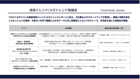 生成AI、GXといった技術起点、モビリティ、エネルギー、ヘルスケアといった業界起点等を中心に、フロスト&サリバンの最新レポートや国際規制動向を用いた産業洞察を提供し、次の10~30年で議題になるテーマを、複数企業・研究者・VCを招き議論します。