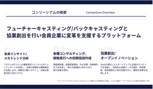 本コンソーシアムは、フロスト&サリバンが持つ世界最先端のメガトレンド分析と技術トレンド分析、フューチャーキャスティング/バックキャスティング、ZenXが持つスタートアップリサーチ/協業実行力を統合した、国内でも類を見ない共創プラットフォームです。