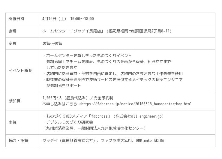 メイテックグループが運営するものづくりWEBメディア「fabcross」は、地方の「ものづくり」活性化を支援するべく、このたび「デジタルものづくり研究会(九州経済産業局、一般財団法人九州地域活性化センター)」、九州の大手ホームセンター「グッデイ」、東京でメイカーズのためのモノづくり施設を運営する「DMM.make AKIBA」と産官連携して、4月16日(土)に福岡市で個人向けものづくりイベントを開催します。
