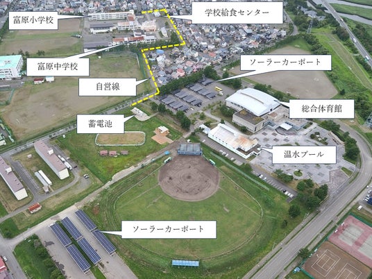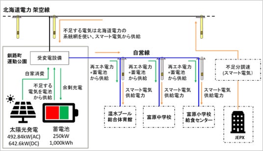 本事業は、釧路町運動公園エリアに位置する総合体育館や温水プールのほか、隣接する富原小学校、富原中学校、学校給食センターの5施設を専用の電線(自営線)で接続し、ソーラーカーポートによる太陽光発電と大容量蓄電池を利用したマイクログリッドを構築するものです。再生可能エネルギーにより発電した電気を効率的に融通し、CO2排出量の削減と地域レジリエンスの強化を図ります。