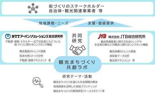 株式会社JTB総合研究所(東京都品川区、代表取締役社長執行役員:風間欣人 以下、JTB総研)と、株式会社NTTアーバンソリューションズ総合研究所(東京都千代田区、代表取締役社長:阿部聡 以下、US総研)は、このたび連携協定を締結し、JTB総研の持つ観光産業の社会トレンドや生活者行動など観光に関わるシンクタンク機能と、US総研の持つ不動産・建築・エネルギー・ICTの知見にもとづいた街づくりに関わるシンクタンク機能を持ち寄り、共同研究する「観光まちづくり共創ラボ」(以下、共創ラボ)を開始しました。