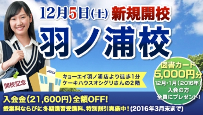 株式会社ワオ・コーポレーションが運営する「個別指導Axis(アクシス)」は、2015年12月5日(土)、徳島県阿南市に「羽ノ浦校」を開校します。