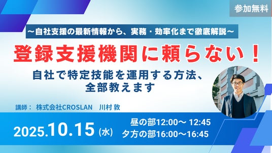 10月15日(水)12:00~、16:00~に自社支援セミナーを開催します。今回は、自社で特定技能を管理するための第一歩となるセミナーになっています。セミナー概要は以下の通りです。