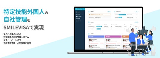 「SMILEVISA」は、受け入れ企業の採用・人事担当者向けに開発された、特定技能外国人の受け入れ業務をDX化するクラウドサービスです。特許取得済みのオンライン申請機能により、入管申請までを最短20分で完了できます。