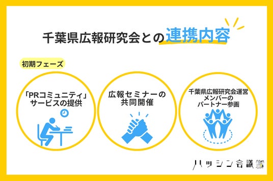 企業の広報組織づくりと人材育成を支援する株式会社ハッシン会議(本社:東京都港区、代表取締役 井上千絵、以下当社)は、千葉日報グループが運営する「千葉県広報研究会」(会長:中元広之)との連携を開始しました。本連携により、千葉県内の産官学における広報活動の支援体制を強化し、広報ノウハウを学べる「PRコミュニティ」サービスの提供や、広報セミナーの共同開催を進めてまいります。