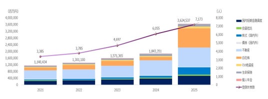 WMWは、ポートフォリオ管理、自社株 ・ 不動産管理、保険設計、税務対策等を統合的に行う統合資産管理システムです。ファミリーの全体資産管理、一次二次相続税試算に加え、リスク許容度を踏まえた最適なアセットアロケーションや複数の税務対策シミュレーションにより、大相続時代に対応した財産承継をサポートするツールとして金融機関やIFA等で活用されています。WMWの登録総資産額が前年比96.6%増となったのは、新たに生命保険会社1社が利用開始したのに加え、銀行をはじめ既存ユーザーの管理顧客数が大幅に増加したことによるものです。登録世帯の資産ポートフォリオの内訳をみると、特に自社株が前年比510%増、国内外の株式が前年比286%増と大幅に伸びています。この要因としては、新規顧客の金融機関が中堅企業オーナー、上場準備中のオーナーやIPOを果たしたオーナーを顧客として抱えており、対策提案に活用していただいていることが、挙げられます。