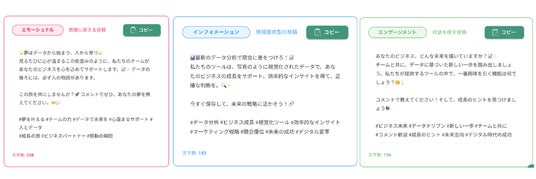 補足情報(トーン、絵文字の有無、ターゲットなど)を指定すれば、より精度の高い生成が可能です。