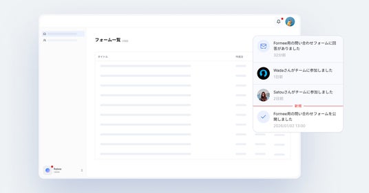 サービス内での通知機能をリリースしました。これにより、チームメンバーの動きやフォームへの回答状況を通知で把握できるため、複数人のチームでも運用しやすくなりました。もちろん、複数のチームに参加している場合も、どのチームに新しい通知が来ているか確認することができます。