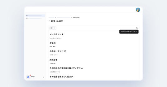 フォームに届いた回答の内容を、従来のテーブル形式の表示に加えて、Markdown形式でも表示できるようになりました。コピー機能も提供しているため、各種ドキュメントへの転記がスムーズに行えます。