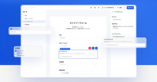 Formeeは、フォームの作成・公開・回答管理を速く、かんたんに行えるWebフォーム作成サービスです。複数選択やファイルアップロードを含む9種類の項目を自由に組み合わせられるため、顧客からのお問い合わせフォームや採用エントリーフォーム、社内向けのアンケートフォームなど、さまざまな用途のフォームを作れます。