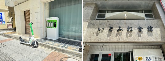 2.糸嶺会館(左:Limeバッテリースワップステーション、右:建物外観)
