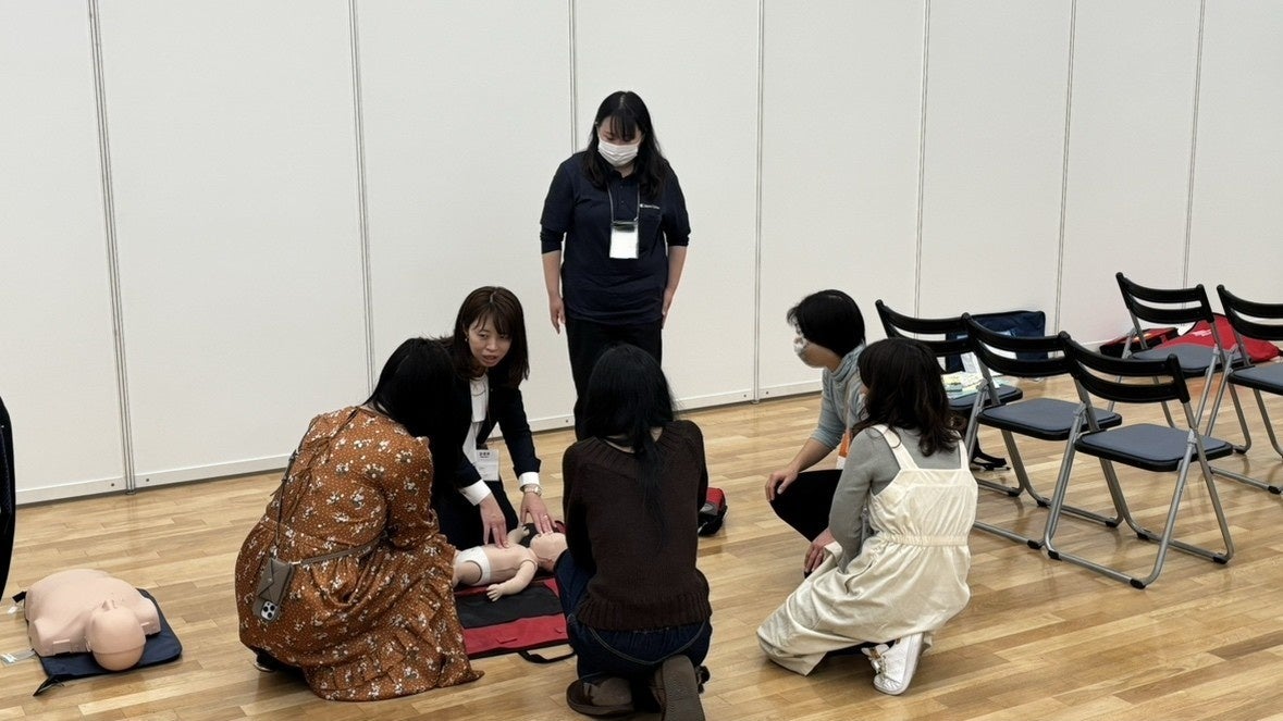 講習会は座学にとどまらず、訓練用AEDとマネキンを使用した実技体験を中心に行われました。参加者は、乳幼児の身体的特徴を踏まえた胸骨圧迫の強さやリズム、AED操作の連携などを真剣な表情で体験。