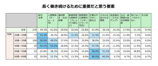 長く働き続けるための要素として、40代までは約半数が「給与水準」を重視し経済的基盤を求めますが、年齢と共に「仕事のやりがい」への意識が向上します 。60代以上では80.0%がやりがいを重視し、給与(20.0%)を大きく上回る結果となりました 。世代間で働く動機が報酬から自己実現へと鮮明に移り変わる実態が浮き彫りとなりました。また、30代・40代では「人間関係(チーム・上司)」、20代~40代では「勤務時間の柔軟性」を重視する傾向が見られます。60代以上では「スキルを活かせる環境」が高く、経験を発揮できる場を求める姿勢がうかがえます。