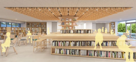 東京都内で進行中の校舎建て替えプロジェクト。特別教室が集約される新棟のライブラリーに国産木材格子ルーバーを導入し、天井の木質化を図ります。木質天井の下には自由に読書や勉強ができるファニチャーを設け、木パネルに反射したやわらかな光が児童・生徒たちの感性や情操を育む環境をつくります。2028年竣工予定。