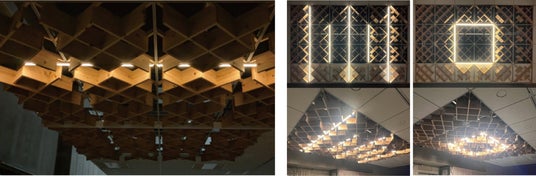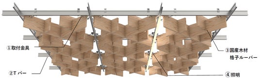 システム天井のフレームに組み込むことができる木材格子ルーバーと照明で構成