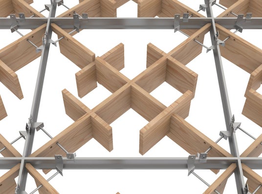 「国産木材格子ルーバー」は、今日広く普及しているグリッドタイプのシステム天井に容易に組み込める木ユニットとして開発しました。規格化されたシステム天井の構成部材(Tバー)を用いて設置できるため、大規模な下地工事を行うことなく木質感のある天井意匠を実現できます。