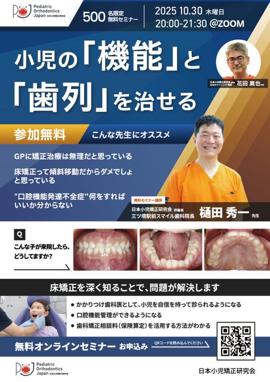 2025年10月30日(木)、日本小児矯正研究会が主催する無料オンラインセミナー「小児の『機能』と『歯列』を治せる ―未来ある子ども達のため小児矯正を―」が開催され、三ツ境駅前スマイル歯科院長樋田秀一が本研究会指導医として講師を担当しました。