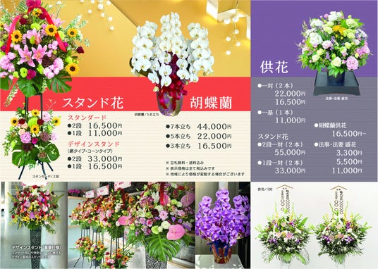 スタンド花は1段11,000円から、デザインスタンドは1段16,500円からの御案内となります。