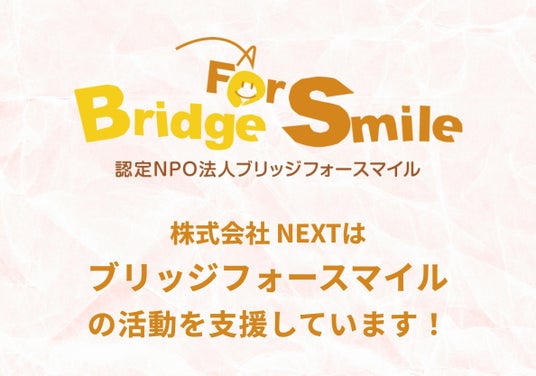 株式会社NEXT(本社:東京都港区芝大門、代表:鈴江将人)は、この度、認定特定非営利活動法人ブリッジフォースマイルの理念に賛同し同法人へ寄付を行いましたことをお知らせいたします。