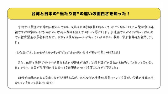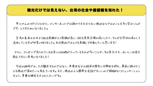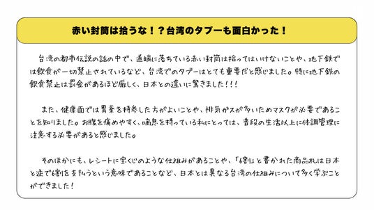 本取り組みは、「観光情報やガイドブックでは触れられない台湾のリアルを、生徒たちに伝えてほしい」という学校側からの依頼を受けて実現しました。